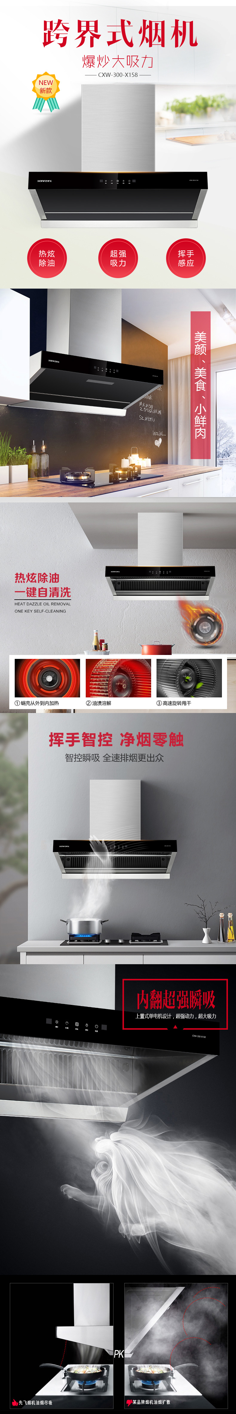 熱炫除油 一鍵自清洗 爆炒大吸力 內(nèi)翻電動開合 超強吸油動力 揮手智控 凈煙零觸 黑晶玻璃 輕輕一抹 煥然一新 大油杯貼墻設計 閃電般速吸油煙 22m3/min