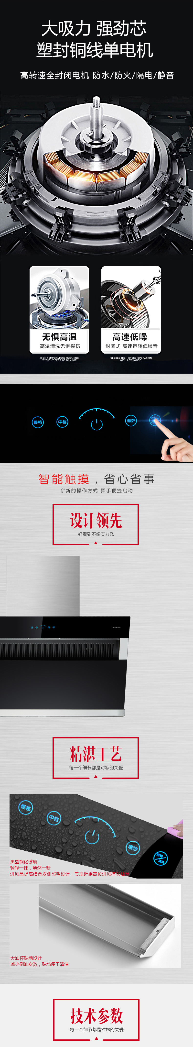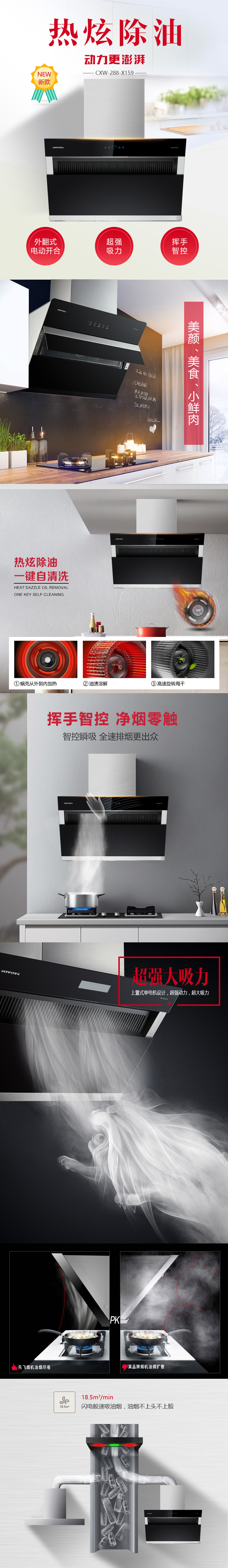 熱炫除油 一鍵自清洗 爆炒大吸力 超強(qiáng)吸油動(dòng)力 揮手智控 凈煙零觸 黑晶玻璃 輕輕一抹 煥然一新 大油杯貼墻設(shè)計(jì) 閃電般速吸油煙 18.5m3/min