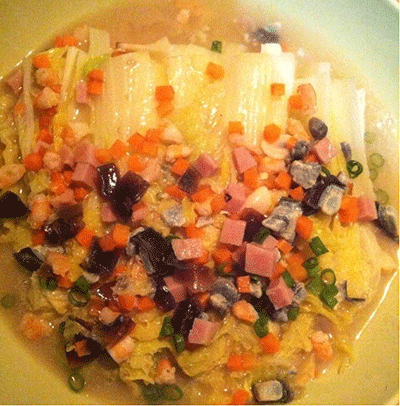 2、將皮蛋、咸肉切小丁和炸蒜末撒在娃娃菜上。(圖2)