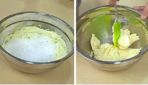 2.加入低筋粉,混合至成面團(tuán)狀,把面團(tuán)分成2份,一份130克,一份115克;(圖2)