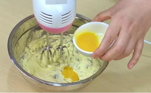 1.把黃油切片放入盆中,攪拌幾下加入糖粉,攪拌均勻加入雞蛋;(圖1)