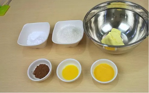 用料:低筋面粉 120g、無鹽黃油 65g、糖粉 40g、可可粉 5g、雞蛋液 20g、雞蛋液(作為粘合劑) 5g