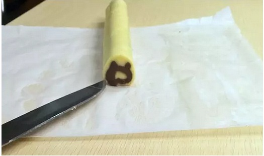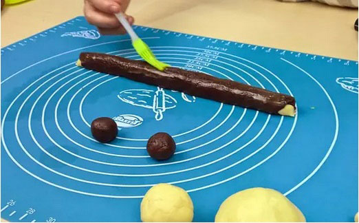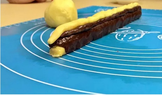 6.可可面團(tuán)表面刷蛋液黏合劑,刷一下表面,取25克原味面團(tuán)搓成17cm的長(zhǎng)度放在面團(tuán)上面的正中央,另取2個(gè)8克可可面團(tuán)放在兩邊;(圖6)