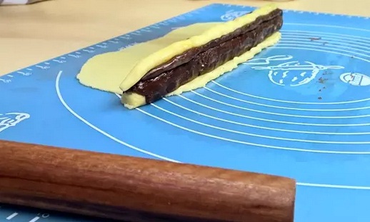 5.把25克的原味面團(tuán)搓成約17厘米的長(zhǎng)條,把104克可可面團(tuán)搓成17厘米,然后搟成長(zhǎng)方形包著原味面團(tuán);(圖5)