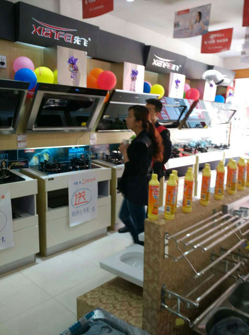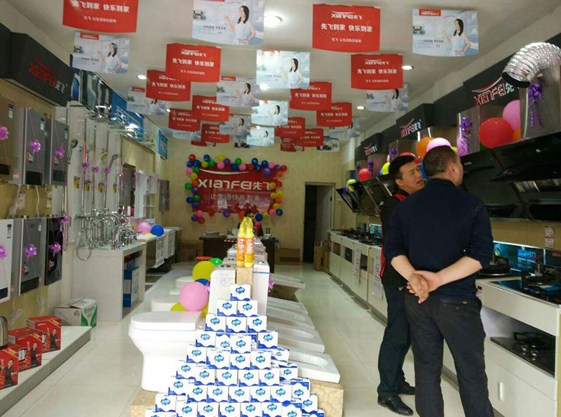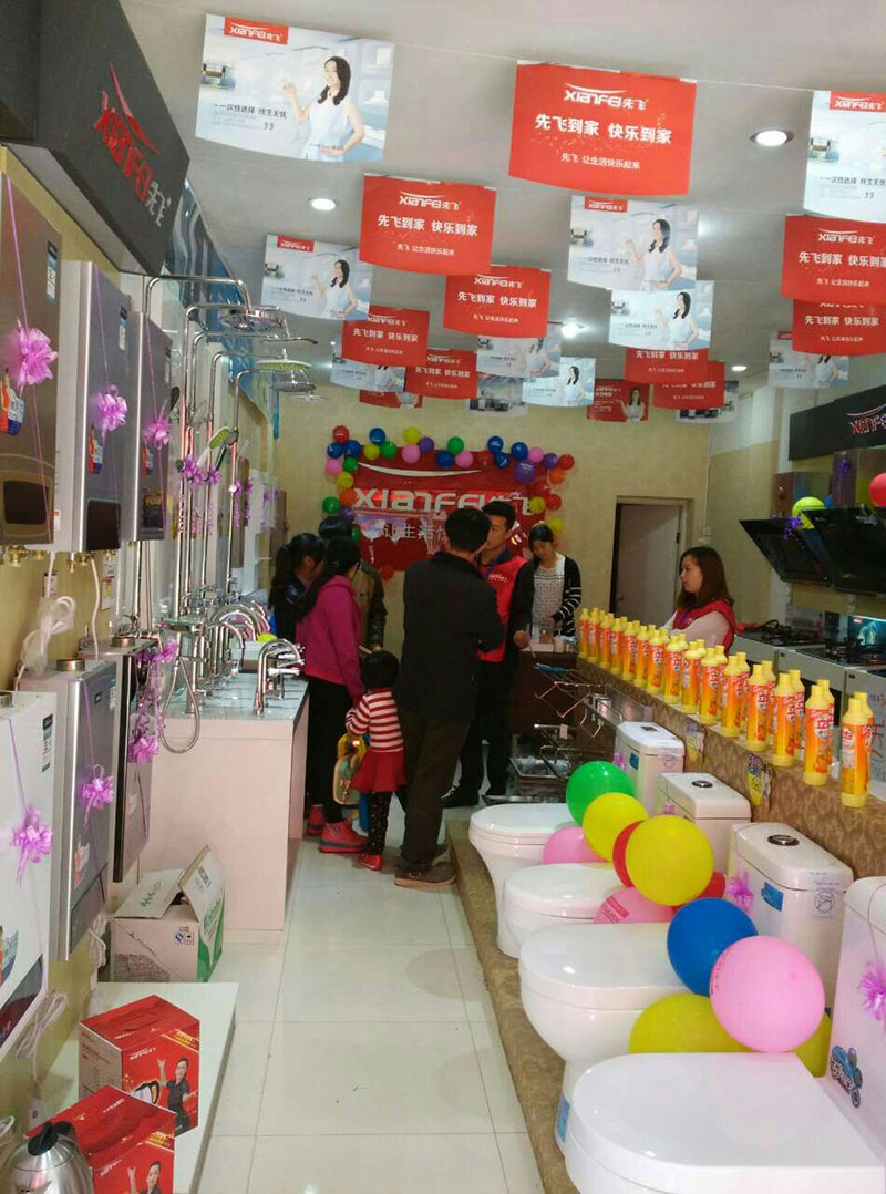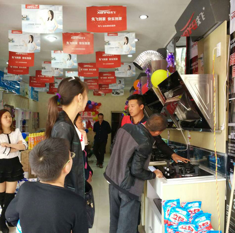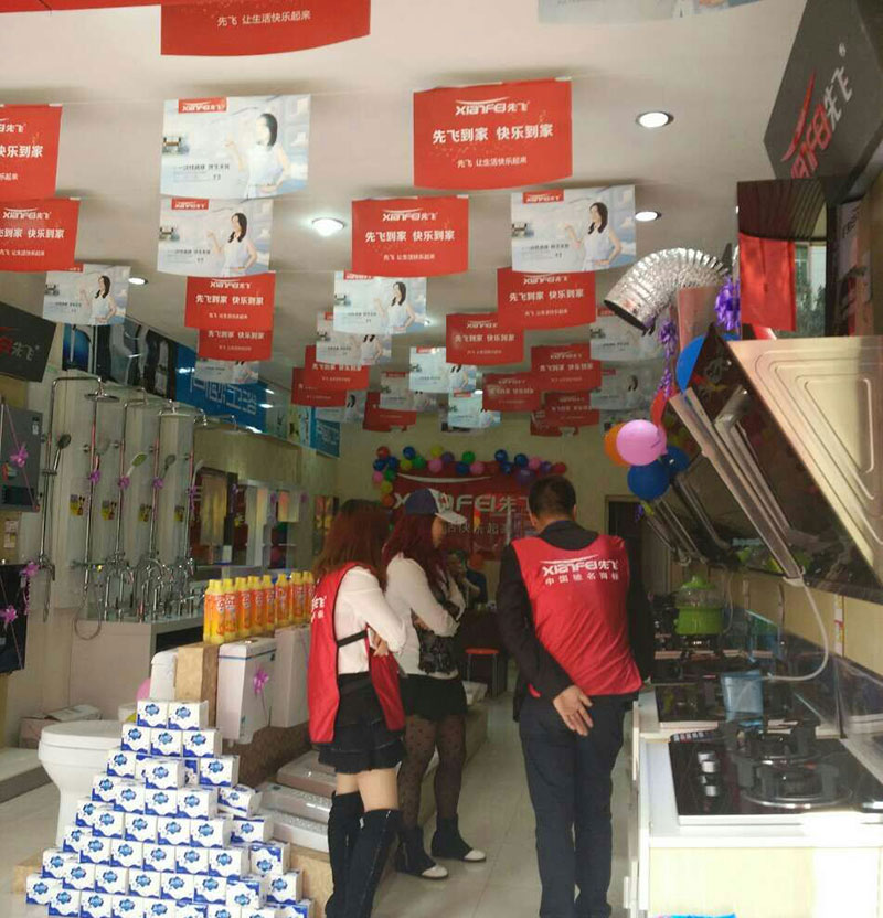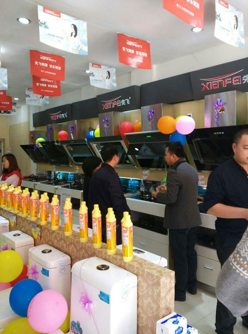 蓬安先飛采用了先飛工廠2015款的標(biāo)準(zhǔn)展架,豐富的煙機(jī),灶具和消毒柜組合,燃?xì)鉄崴鹘M合,全面的展示了先飛系列產(chǎn)品形象。喜慶的汽球,彩帶,先飛吊旗等物料,以及品類繁多的贈品更是錦上添花!
