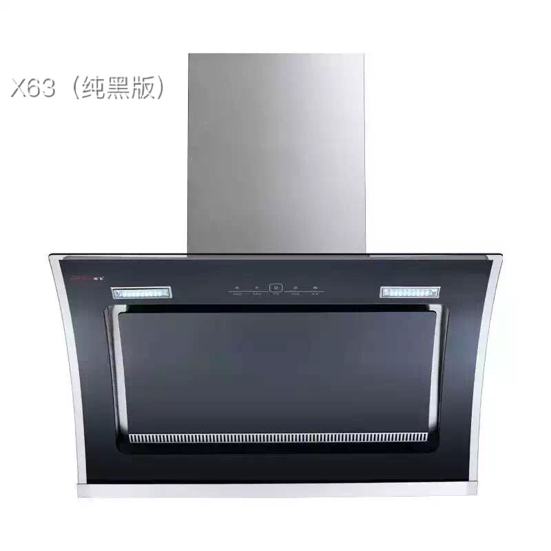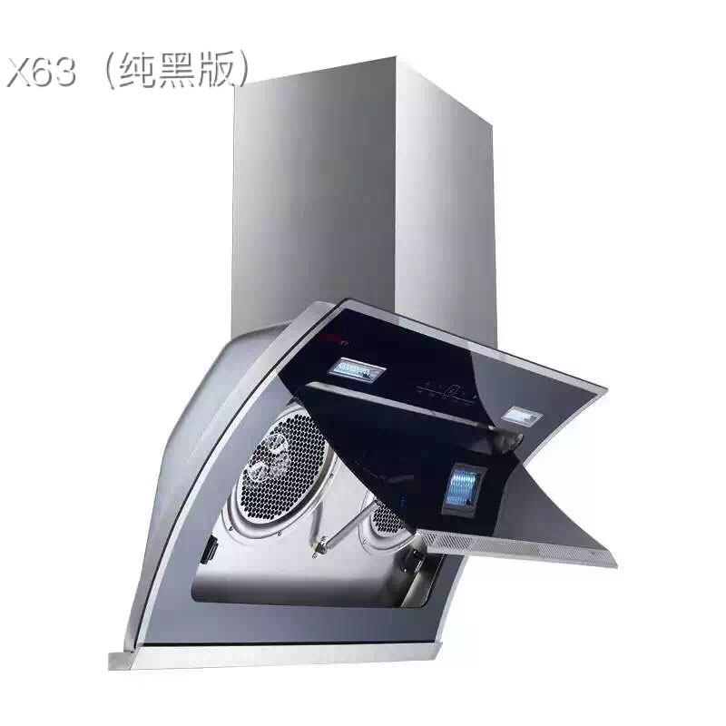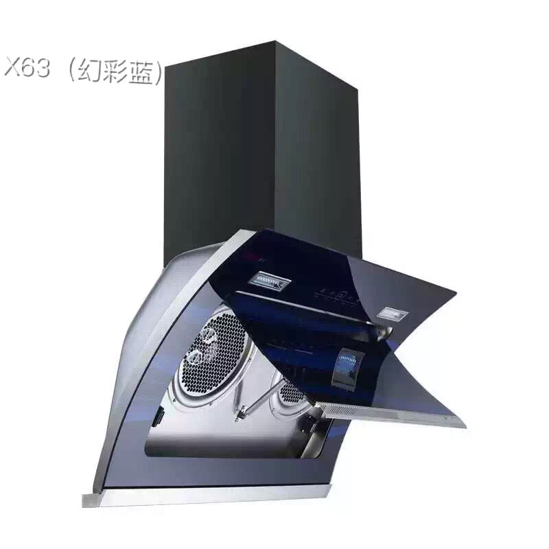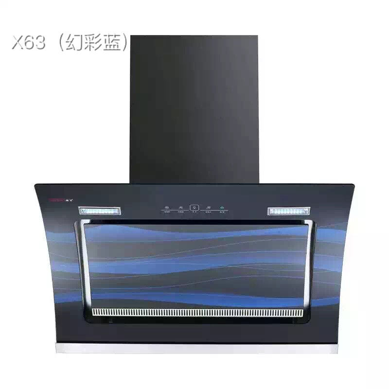 產(chǎn)品配置:大弧玻雙電機 電腦觸摸 大吸力系列 幻彩藍玻璃 黑鈦金加高加厚圍板 二級能效 機身長900mm(照片01 02)