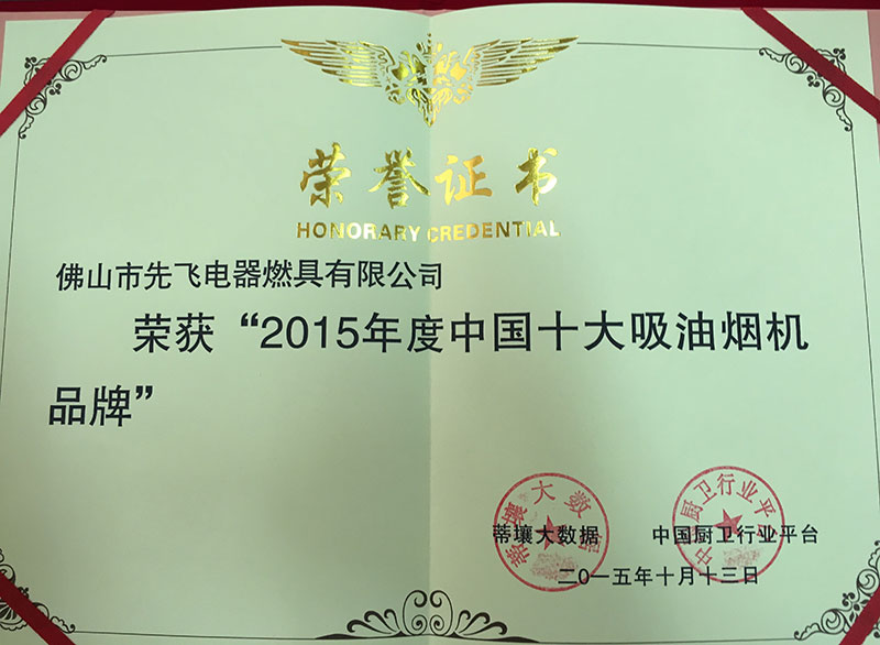 二.2015年10月,先飛公司斬獲“2015年度中國(guó)十大吸油煙機(jī)品牌”!