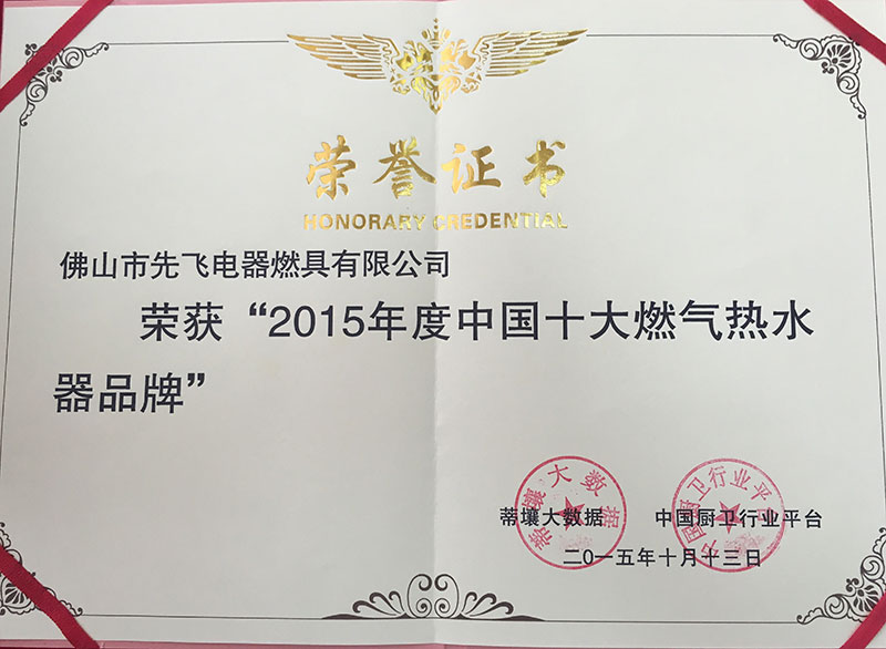 三.2015年10月,先飛公司斬獲“2015年度中國(guó)十大燃?xì)鉄崴髌放啤保?/strong>