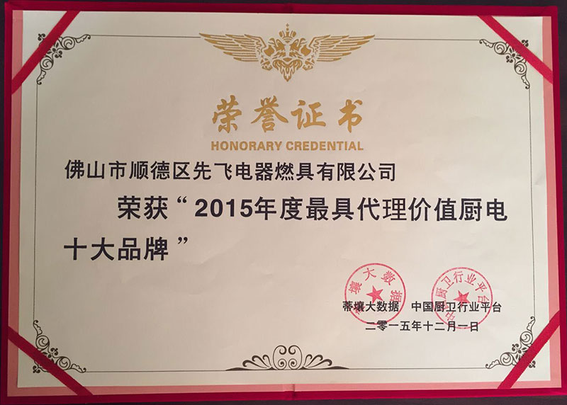 一.2015年12月,先飛公司斬獲“2015年度最具代理價(jià)值廚衛(wèi)十大品牌”!