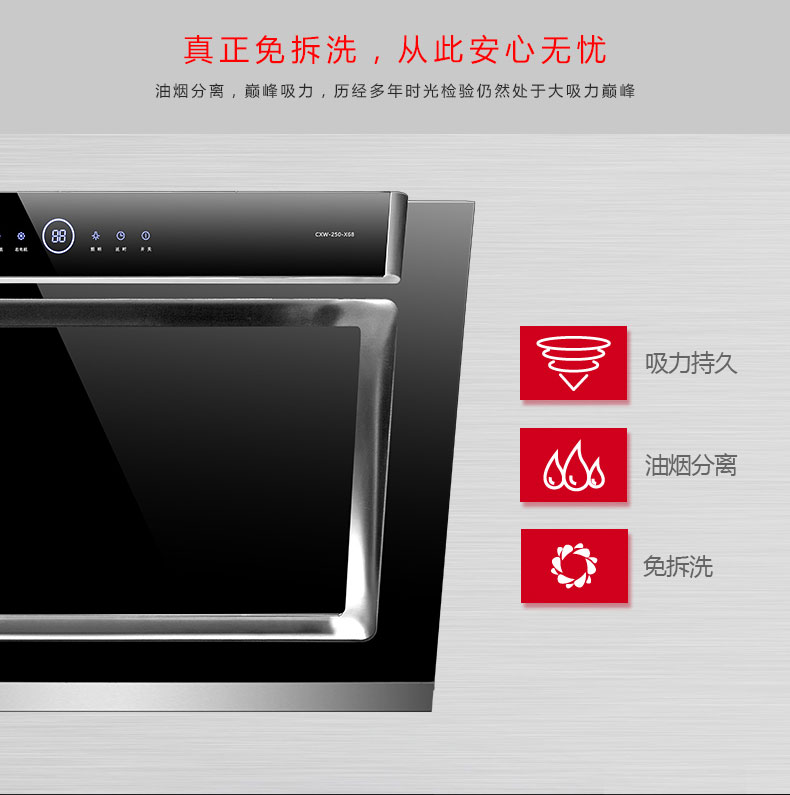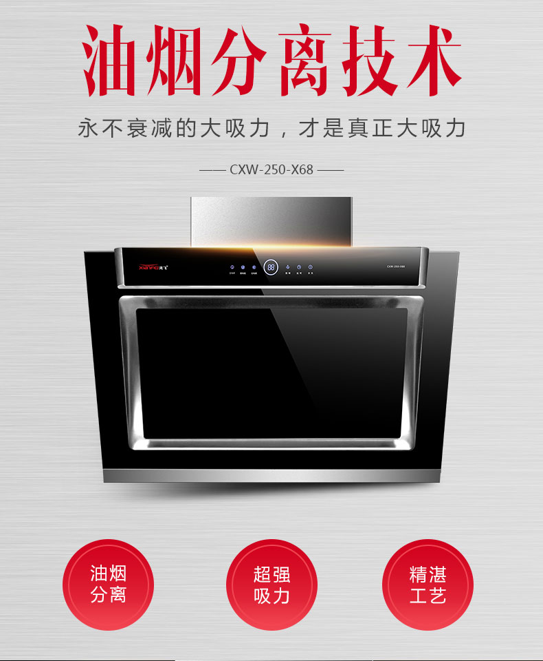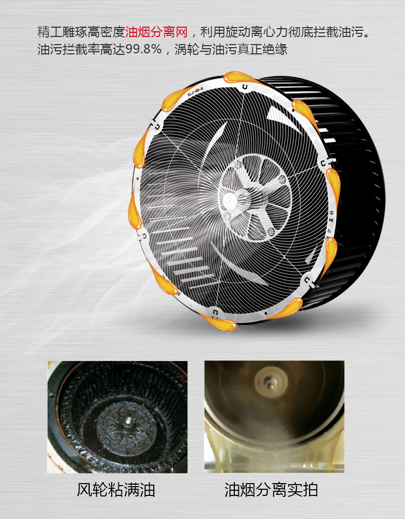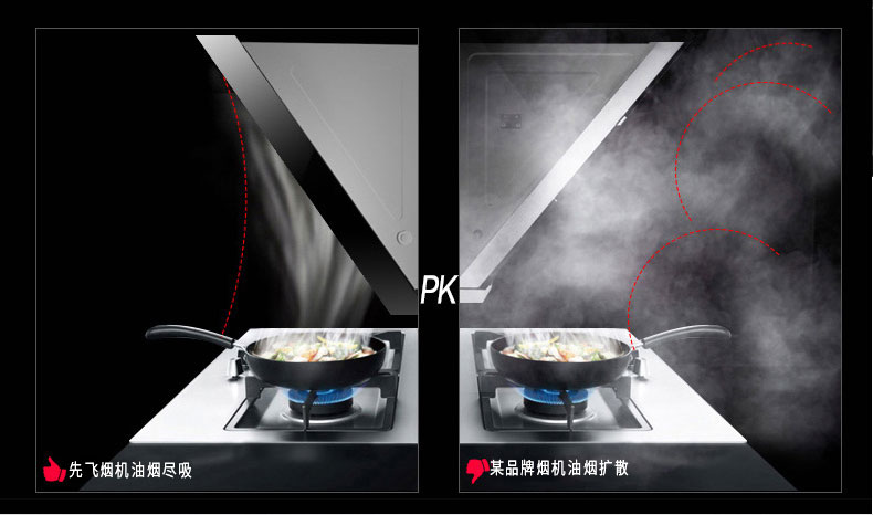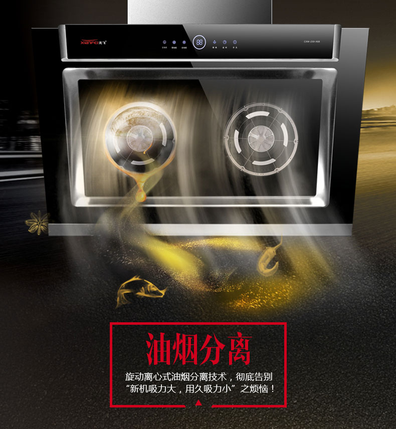 相比上一代油網(wǎng)靜態(tài)油煙分離技術(shù),先飛旋動(dòng)離心式油煙分離技術(shù)有著以下幾大顯著優(yōu)勢(shì):①先飛旋動(dòng)離心式油煙分離技術(shù)術(shù)語(yǔ)實(shí)現(xiàn)油煙主動(dòng)分離,油煙分離率更高,可達(dá)99.8%,而上一代油網(wǎng)靜態(tài)油煙分離技術(shù)屬于被動(dòng)分離,油煙分離率普遍較低;②先飛旋動(dòng)離心式油煙分離煙機(jī)吸力可達(dá)到大吸力參數(shù)要求,而上一代油網(wǎng)靜態(tài)油煙分離煙機(jī)吸力普遍較??;③先飛旋動(dòng)離心式油煙分離煙機(jī)機(jī)型更加美觀大氣時(shí)尚,而上一代油網(wǎng)靜態(tài)油煙分離煙機(jī)基本上是處于市場(chǎng)邊緣化的不銹鋼煙機(jī);④先飛旋動(dòng)離心式油煙分離技術(shù)無(wú)需拆洗,沒有售后,而上一代油網(wǎng)靜態(tài)油煙分離煙機(jī)需要經(jīng)常拆洗油網(wǎng)。