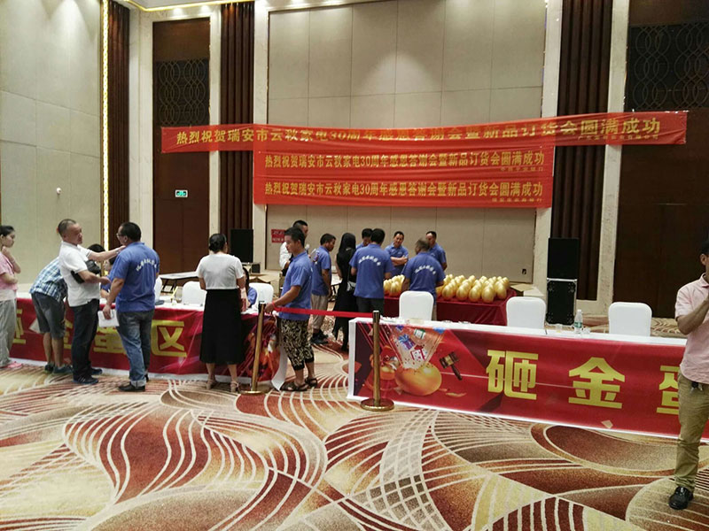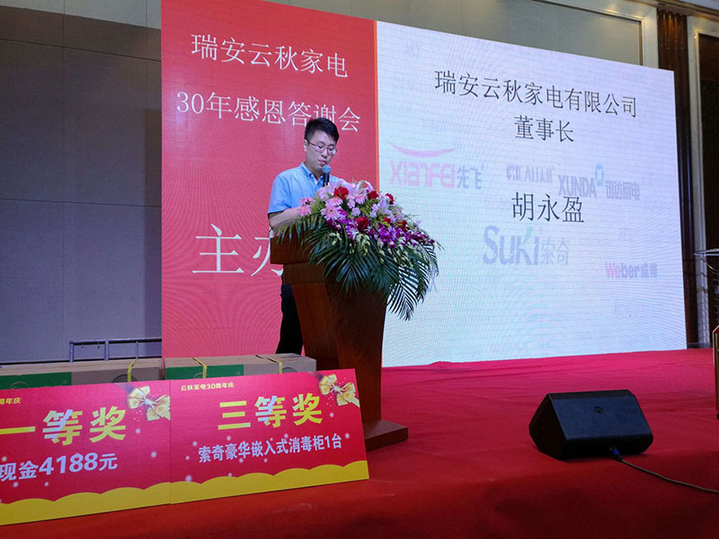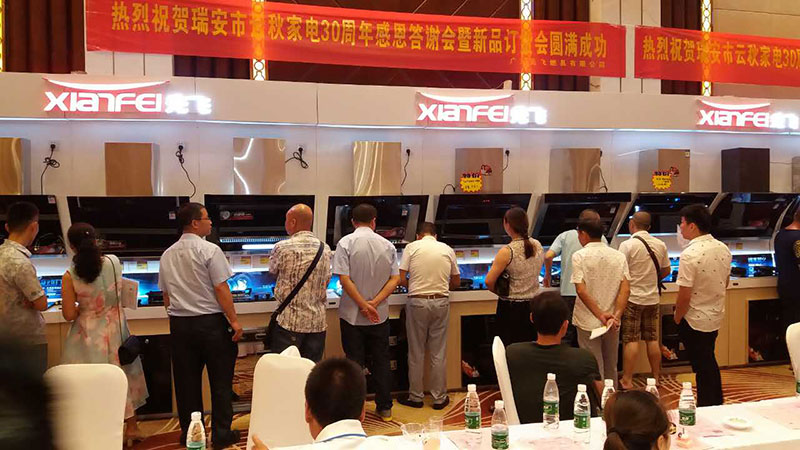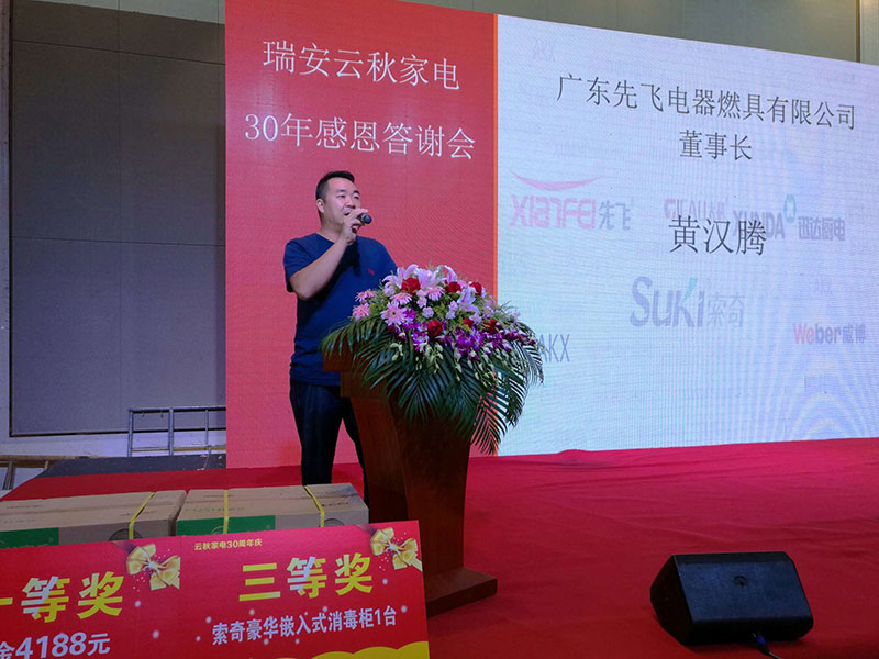 編者按:2016年8月8日下午,云秋家電30周年感恩答謝會(huì)暨2016年先飛秋季新品訂貨會(huì)在瑞安喜來(lái)君悅大酒店火爆召開!溫州地區(qū)參會(huì)經(jīng)銷商朋友多達(dá)30桌,近300多人。在云秋家電30周年之際,先飛公司董事長(zhǎng)黃漢騰先生在會(huì)上回顧往昔,展望未來(lái),分享先飛公司近況與新品,贏得大家熱烈掌聲!會(huì)議期間收款超過(guò)300萬(wàn),標(biāo)志著會(huì)議圓滿成功!