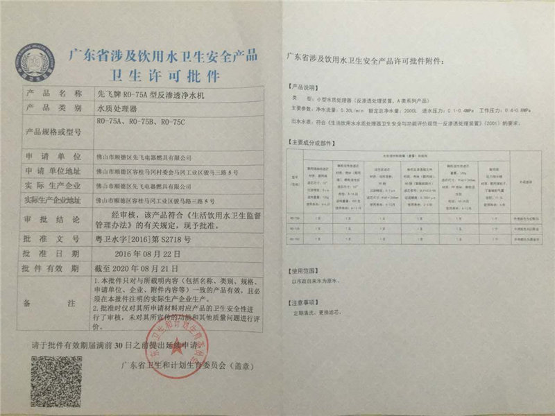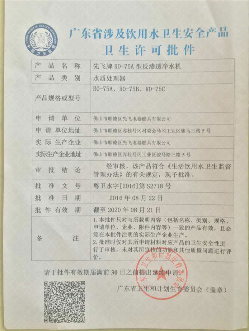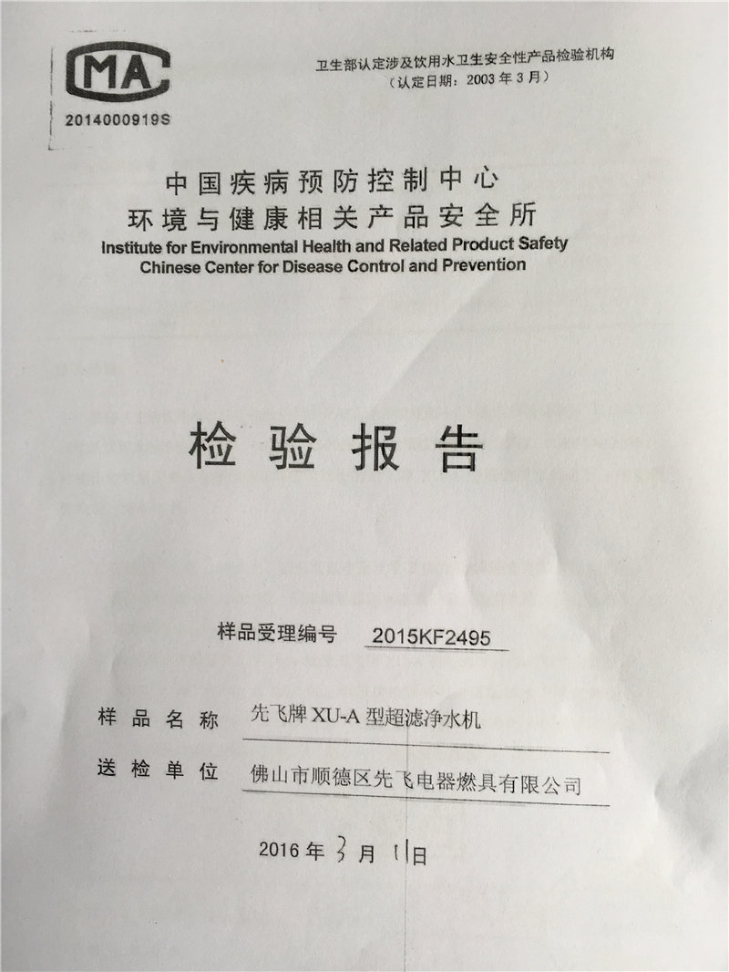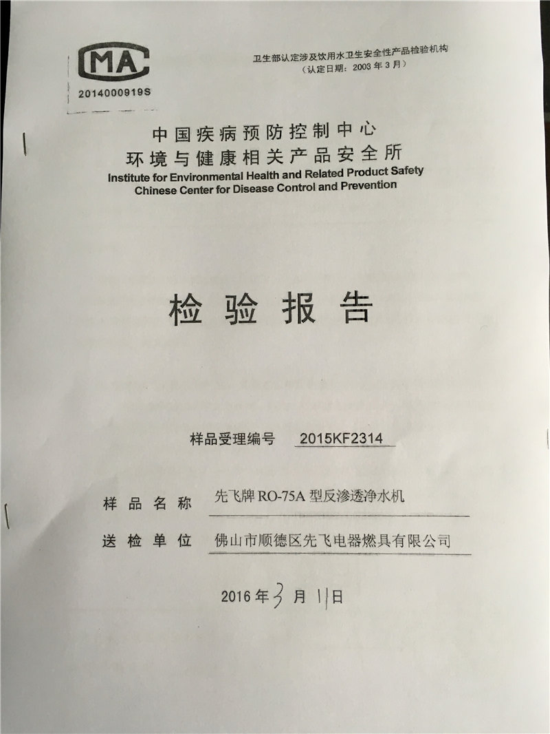 先飛公司提示您:購(gòu)買凈水機(jī)一定要關(guān)注兩大批件:一是凈水器檢測(cè)報(bào)告,二是涉水產(chǎn)品衛(wèi)生批文,也常簡(jiǎn)稱為“涉水批文“、”水批”。所謂涉水產(chǎn)品衛(wèi)生批文,是由省衛(wèi)生與計(jì)劃生育委員會(huì)認(rèn)證頒發(fā),從凈水器機(jī)器質(zhì)量到出水品質(zhì)都已經(jīng)全方位檢驗(yàn)合格并許可上市銷售。