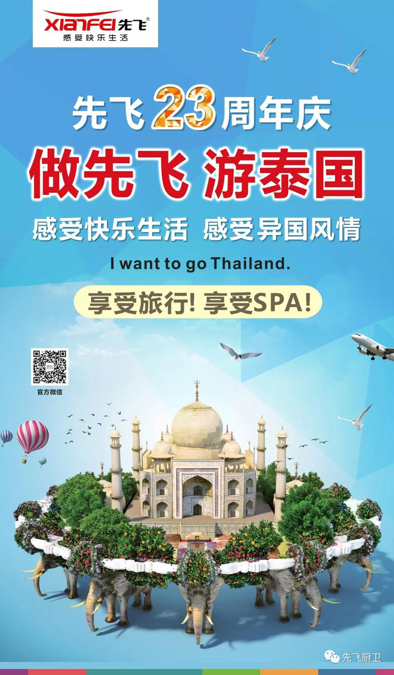 先飛以感受快樂生活為品牌核心文化,感恩與福利之旅先從營銷團隊開始。2017年上半年公司總部營銷團隊出游新加坡+馬來西亞。下半年營銷團隊出游泰國:感受國際大都會曼谷、浪漫芭堤雅、享受SPA.....為答謝全國各級先飛終端零售商的支持與厚愛,值先飛電器23周年慶之際,特舉辦“做先飛,游泰國”活動。