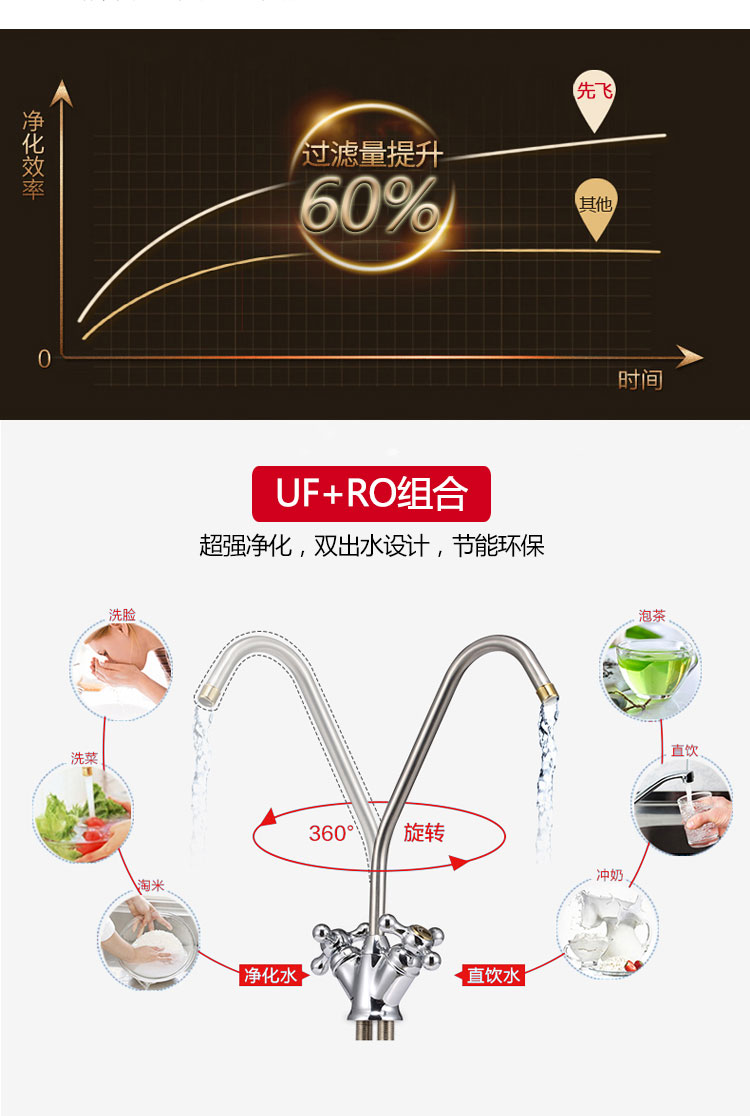 UF+RO組合,超強(qiáng)凈化,雙出水設(shè)計(jì),節(jié)能環(huán)保;