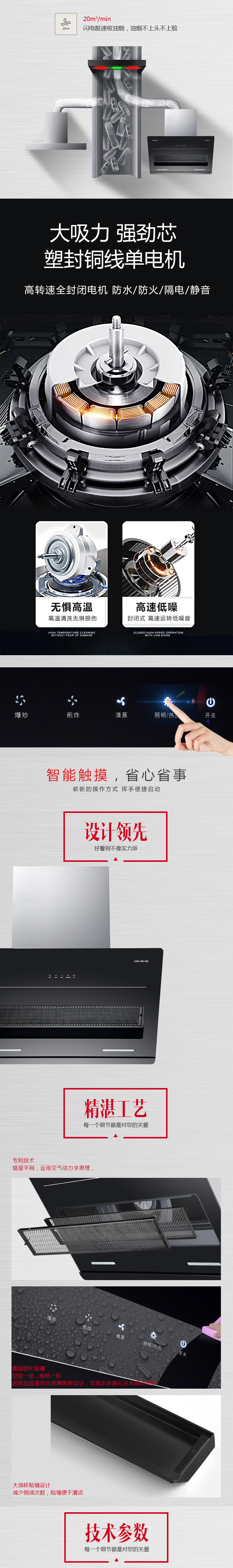 熱炫除油 一鍵自清洗 易拆式油網(wǎng) 超強(qiáng)吸油動(dòng)力 揮手智控 凈煙零觸 黑晶玻璃 輕輕一抹 煥然一新 大油杯貼墻設(shè)計(jì) 閃電般速吸油煙 21m3/min